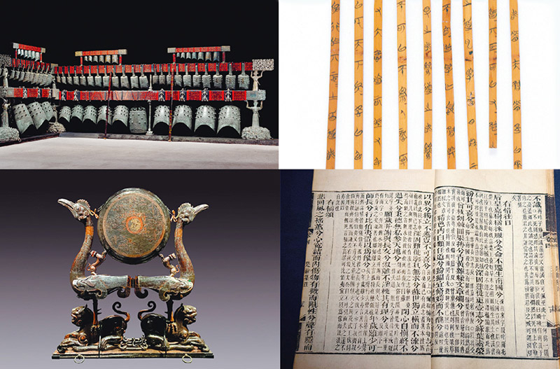 湖北省博物馆是荆楚文化的渊薮殿堂,藏品体系完整、数量丰富、质量精湛、地域特色鲜明,在国内外享有盛誉。左上图为曾侯乙编钟,右上图为郭店竹简《老子》乙(局部),左下图为虎座鸟架鼓,右下图为《楚辞集注》(清代湖北崇文书局刻本)。 湖北省博物馆供图