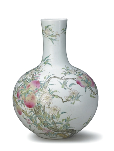2025年10月10日,故宫博物院迎来建院100周年。图为“百年守护——从紫禁城到故宫博物院”展览展出的粉彩九桃图天球瓶。 |
